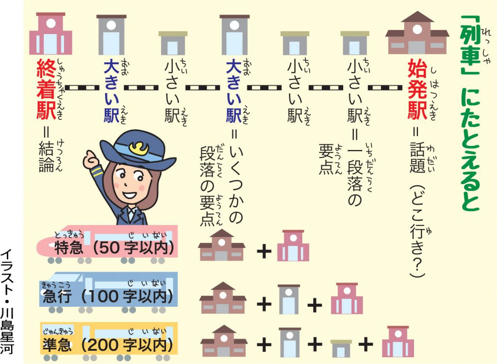 国語読解力をつけるには、文章の要約練習がおすすめ 学習 「 字要約」問題の解説と答え 問題1の文の主語は、「先週は」ではなく「今週は」です。そして、今週はどうなるのかというと、「暑い日が続く」のでこれが述語になります。気をつけたいのは、文末表現です。天気予報ですから、文末の「~でしょう」は外せません。 要約に絞って数多く練習させたいとただし、小論文の要約問題では、 課題文の要約 と 自分の意見・感想 の2つが求められるケースが多いので注意が必要です。 それぞれ別に書くよう指示される場合もあれば、単に 「課題文を読んで自分の考えを 字以内にまとめよ」 といった出題形式もあるようです。 同時通訳者Erika流「要約の自主練習方法」 こんにちは、 英語同時通訳者 で オンライン英語・通訳講師 の山下えりかです。 話し手の言葉を一言一句正確に記憶して正確に声に出して繰り返す「リテンション&リプロダクション」と並び通訳の基礎訓練の2